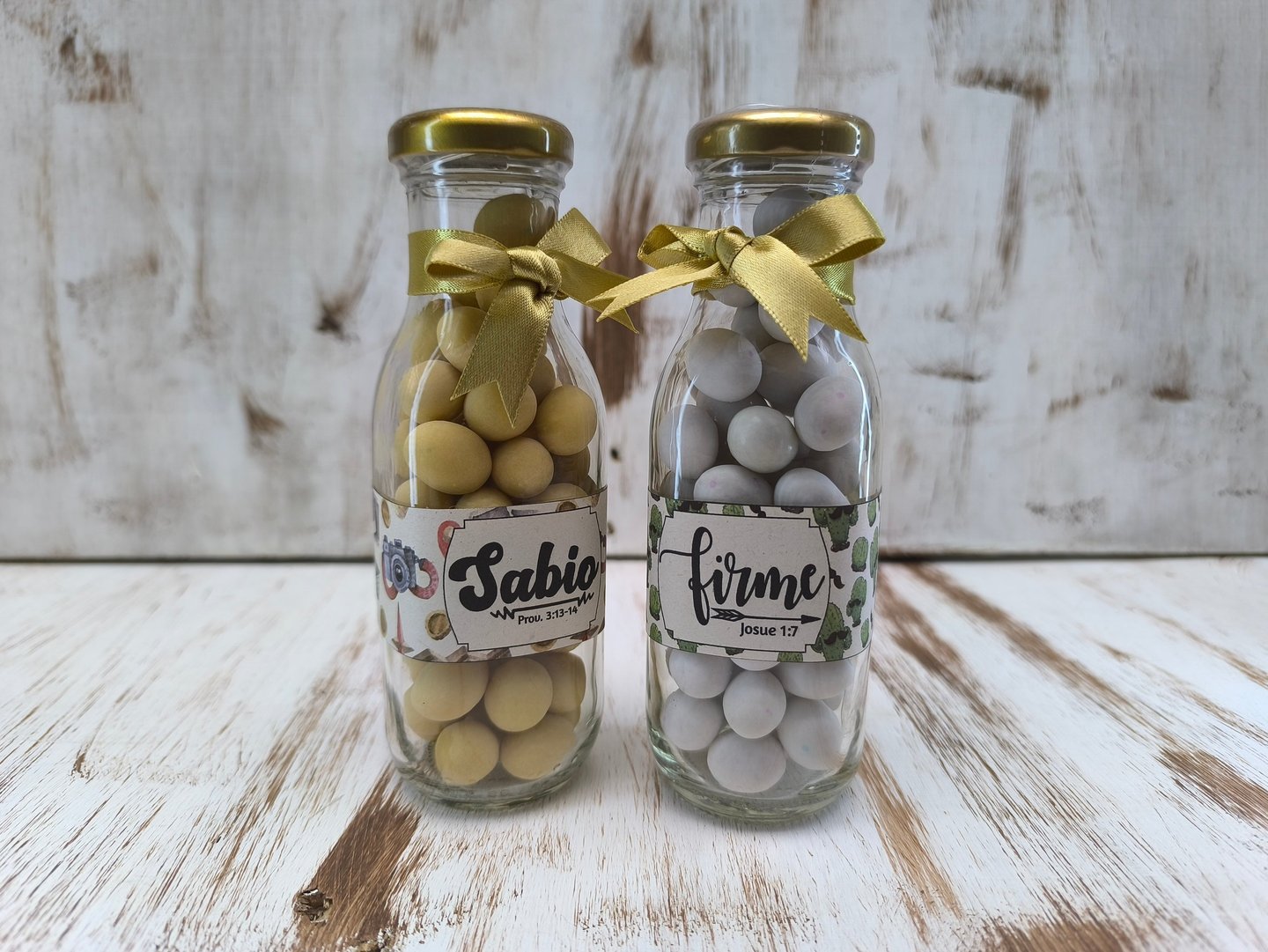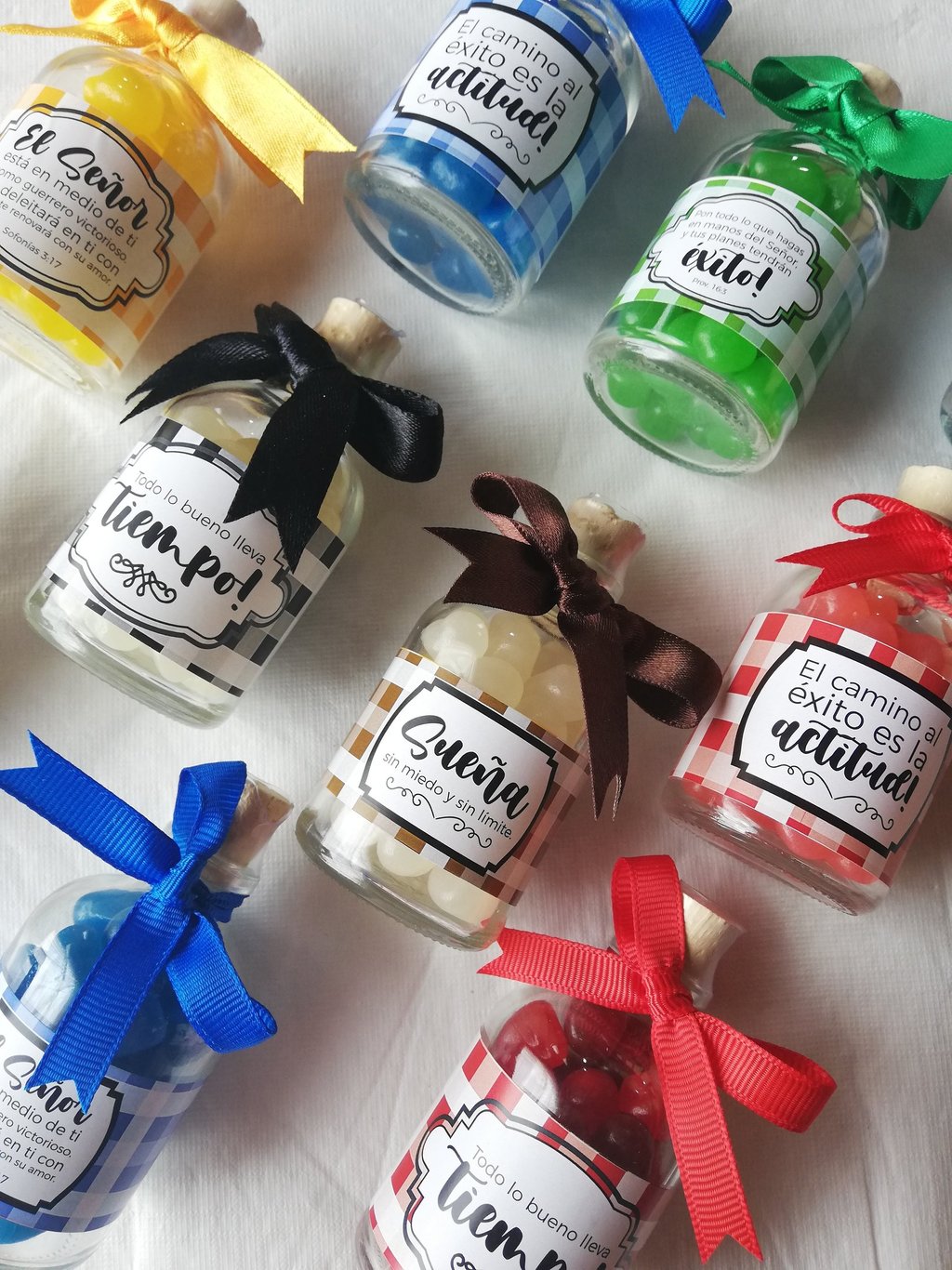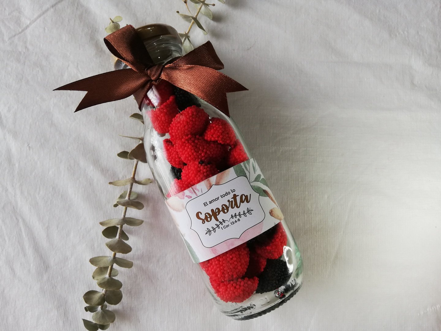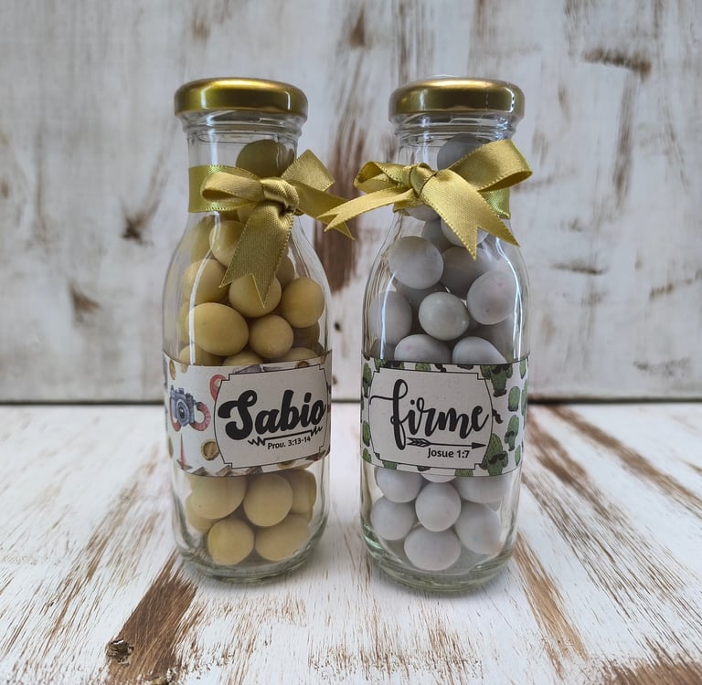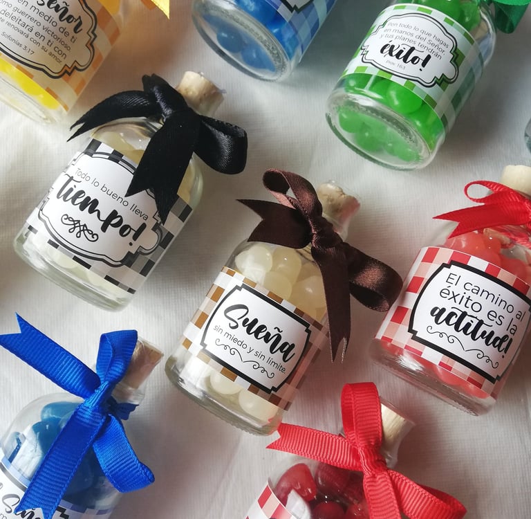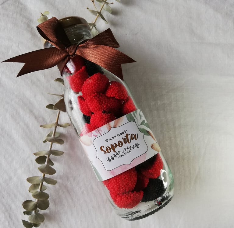 Botella de vidrio de 250ml rellena con gomitas, etiqueta con diseño de acuerdo a la ocasión y cinta decorativa.