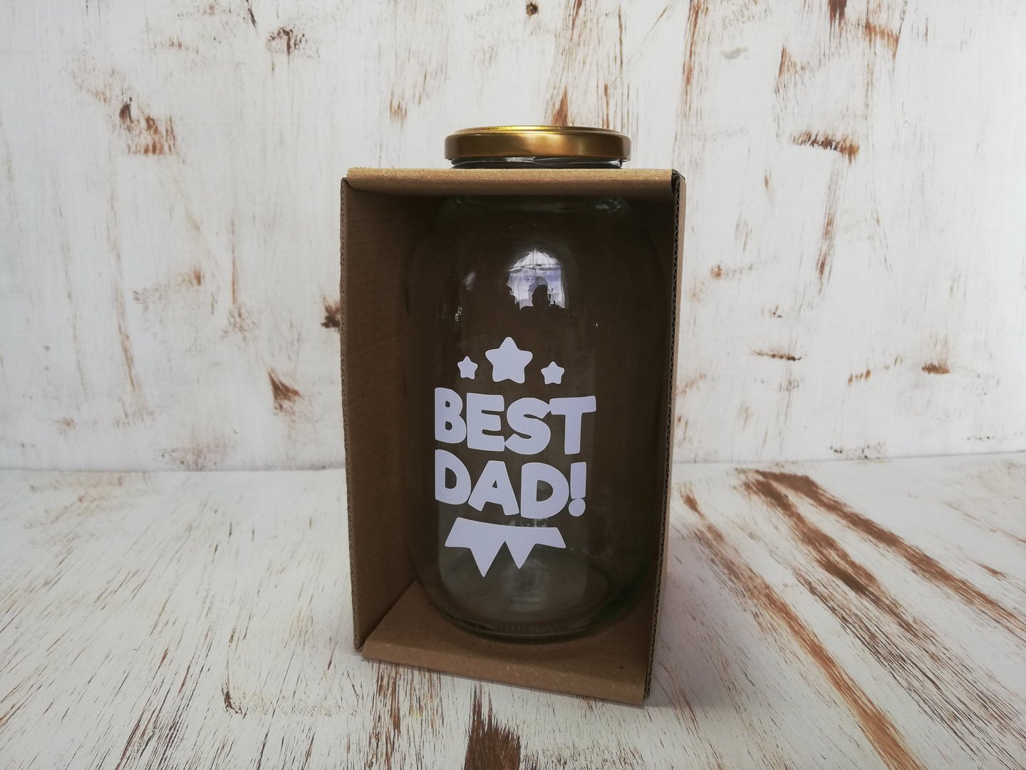 Botella de vidrio de 1000cc con mensaje personalizado en vinilo de corte (caracteres limitados), empacada en caja de cartón kraft abierta a medida.