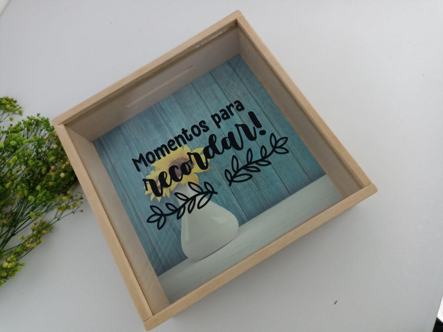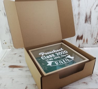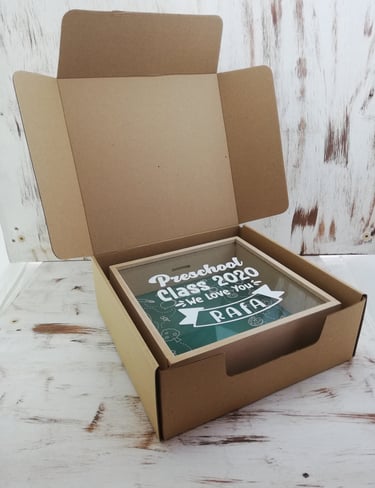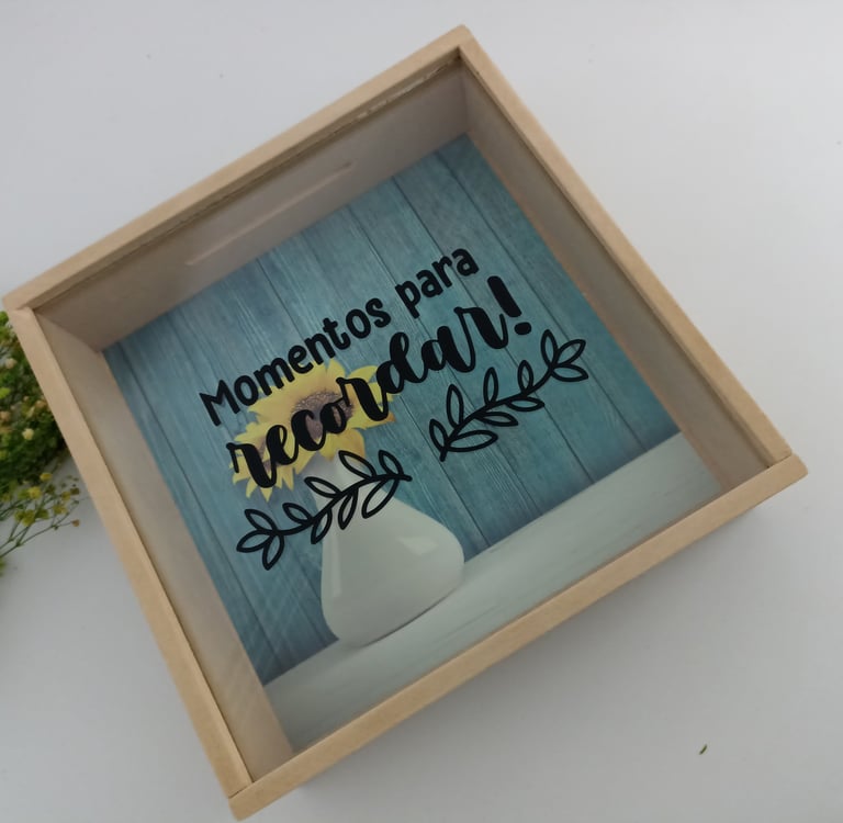 Alcancía en MDF de 24x24x8cm con fondo a elección y mensaje personalizado en vinilo de corte (caracteres limitados), empacada en caja de cartón kraft a medida con cinta decorativa y una tarjeta personalizada según la ocasión.
