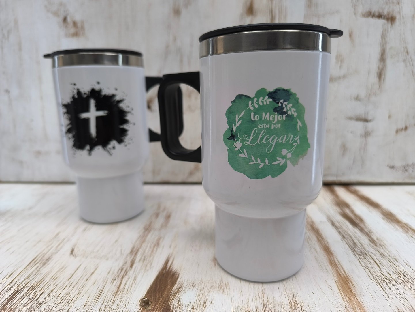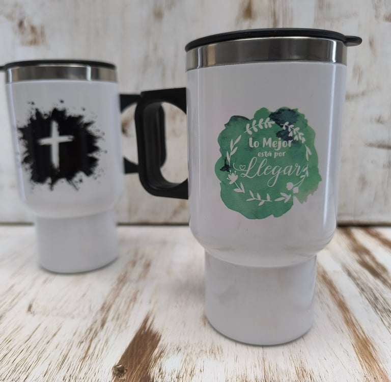Vaso viajero metálico de 400ml sublimado con diseño a elección, empacado en caja de cartón Kraft a medida con cinta decorativa y una tarjeta personalizada según la ocasión.