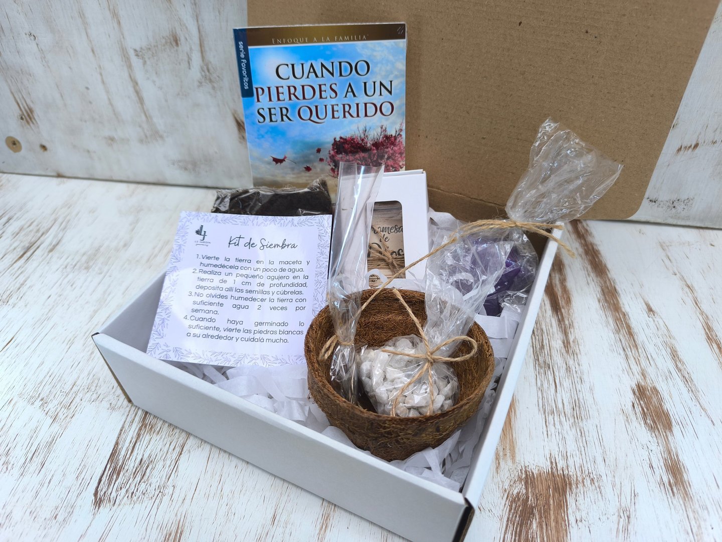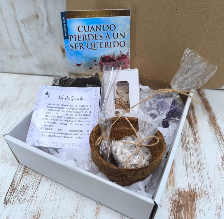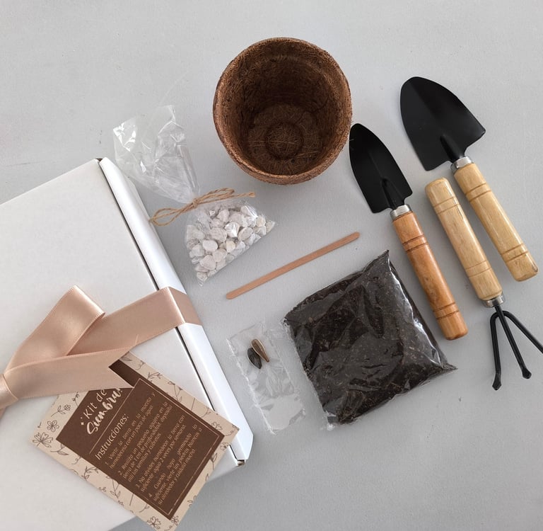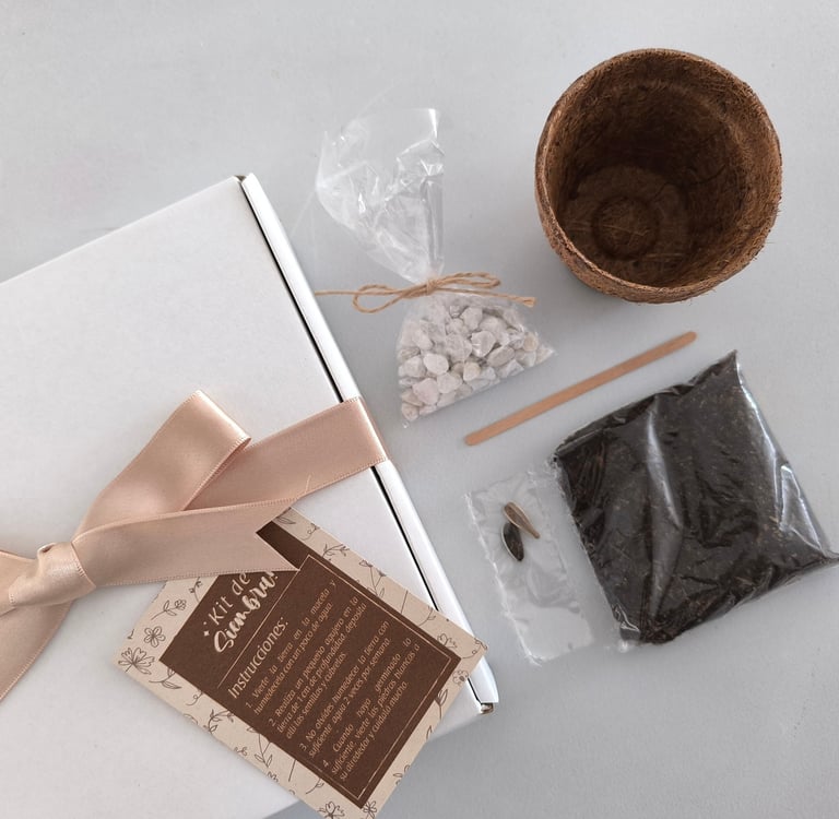 Kit de Siembra: Matera en fibra de coco, tierra fertilizada, semillas florales y piedras decorativas.