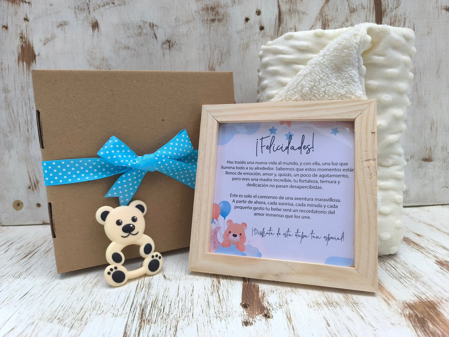 Manta viajera en piel de conejo de 180x100cm, empacada en caja de cartón kraft a medida con cinta decorativa y una tarjeta personalizada según la ocasión.