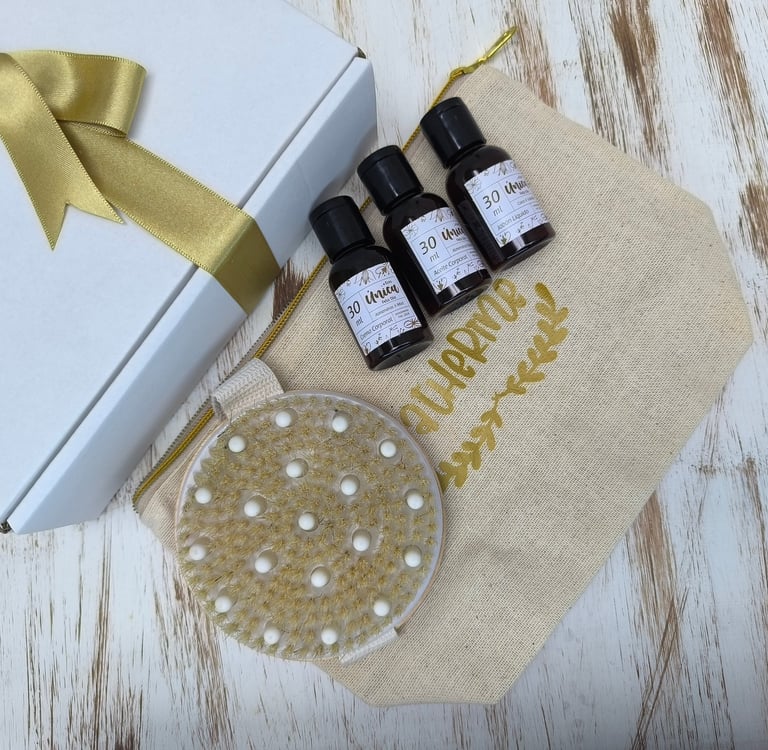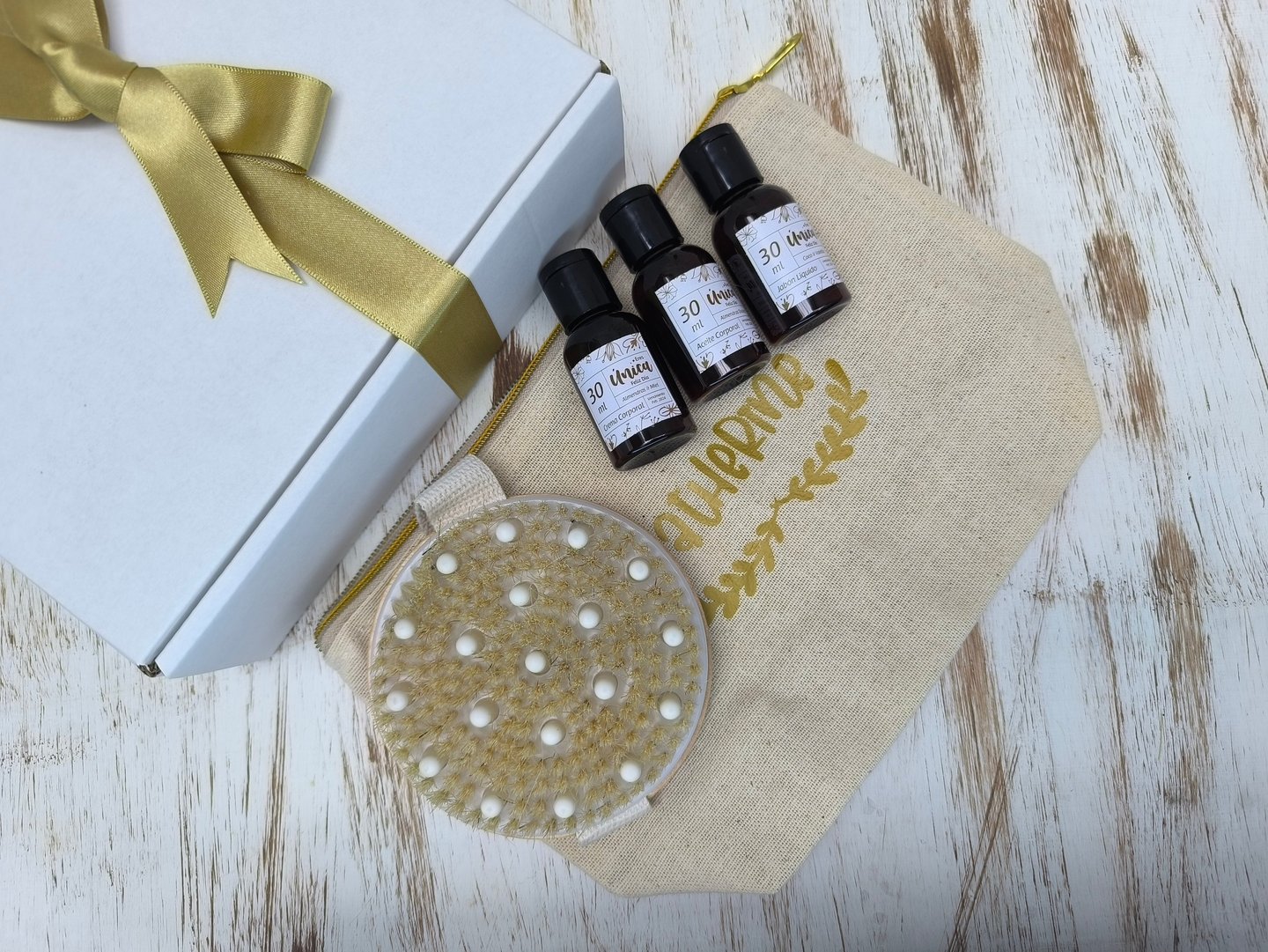 3 Botellas de 30ml que contienen: Jabón Líquido, Crema Hidratante y Aceite Corporal. .