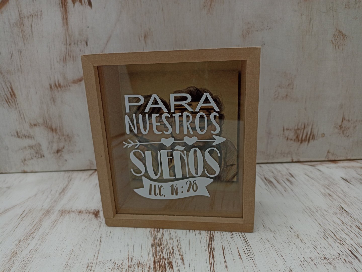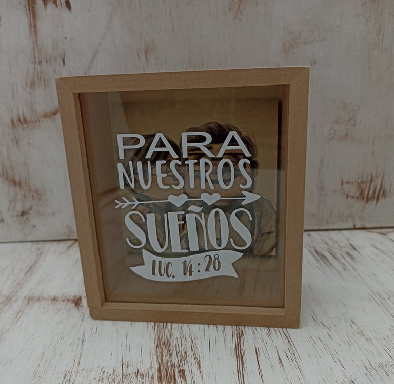 Alcancía en MDF de 16x14x6cm con fondo a elección y mensaje personalizado en vinilo de corte (caracteres limitados), empacada en caja de cartón kraft a medida con cinta decorativa y una tarjeta personalizada según la ocasión.