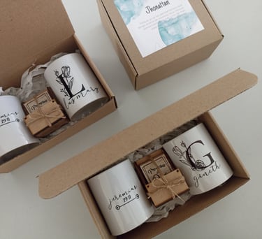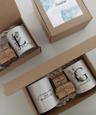 Taza de 11oz sublimada con diseño a elección, empacado en caja de cartón kraft a medida con cinta decorativa y una tarjeta personalizada según la ocasión.