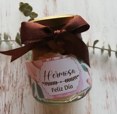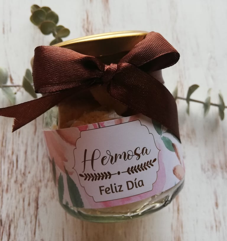 Botella de vidrio de 230ml rellena con mini galletas, etiqueta con diseño de acuerdo a la ocasión y cinta decorativa.