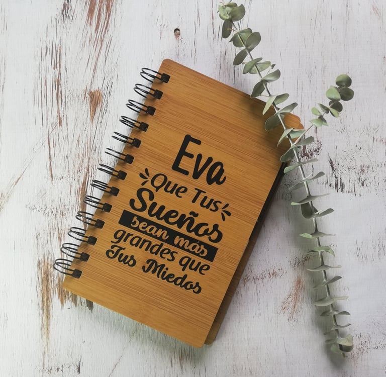 Agenda con tapa en Bambú de 17.5x12.5x2cm que incluye notas adhesivas y esfero ecológico, en la tapa es marcada con mensaje personalizado en vinilo de corte (caracteres limitados).