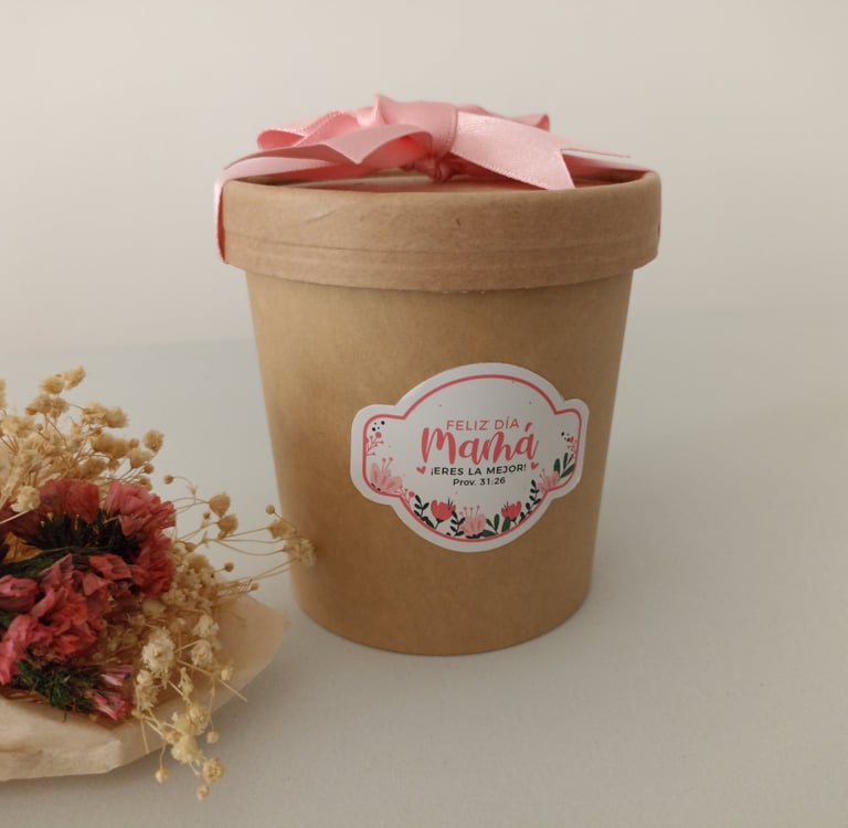 Bowl ecológico de 16oz relleno con minigalletas, etiqueta con diseño de acuerdo a la ocasión y cinta decorativa.