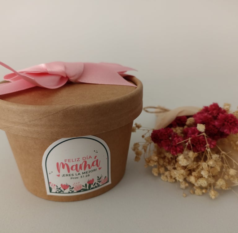 Bowl ecológico de 8oz relleno con minigalletas, etiqueta con diseño de acuerdo a la ocasión y cinta decorativa.